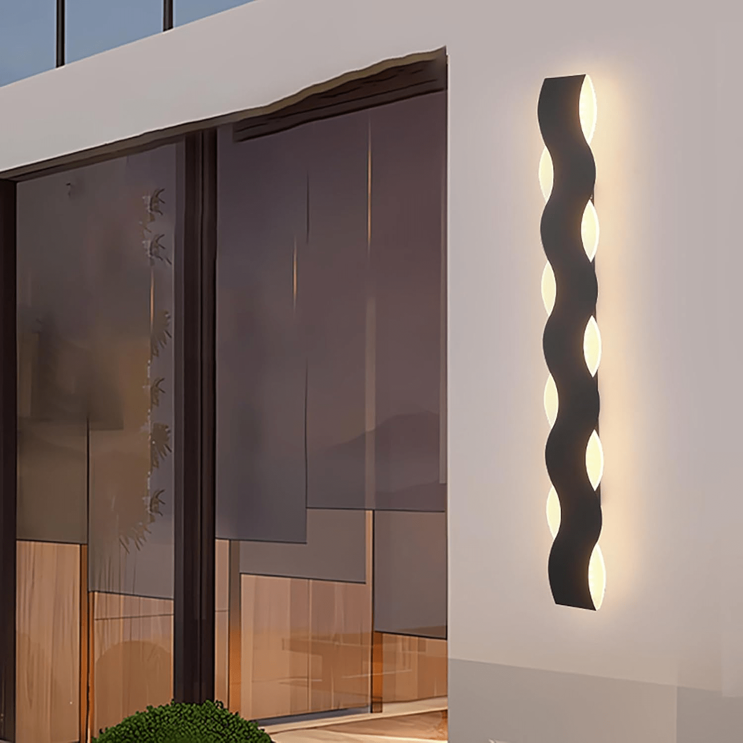 Nowoczesny kinkiet zewnętrzny LED w kształcie fali to efektowny sposób na oświetlenie elewacji, tarasu lub wejścia do domu. Dekoracyjna forma podkreśla architekturę budynku i nadaje mu elegancki, współczesny charakter.