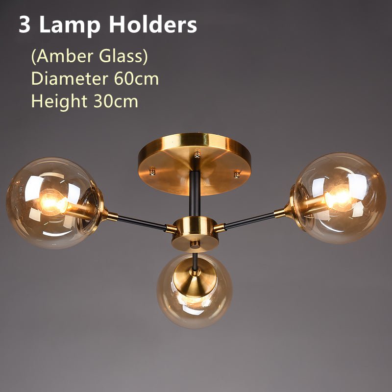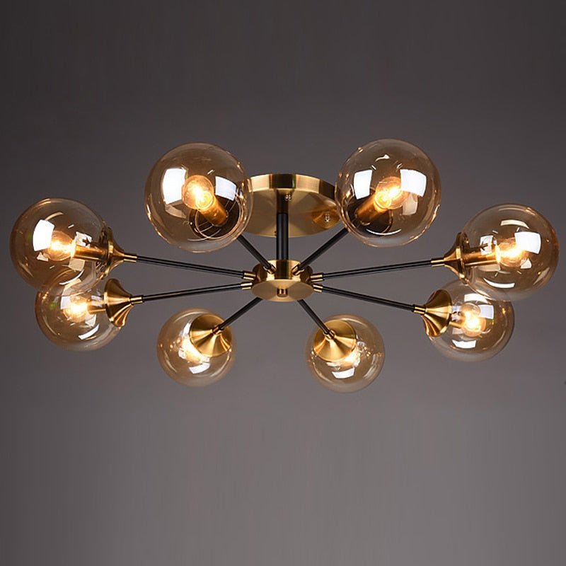 Nowoczesny żyrandol sufitowy z kulistymi, szklanymi kloszami w miedzianym wykończeniu to elegancka propozycja do salonu, sypialni, jadalni czy reprezentacyjnego korytarza.