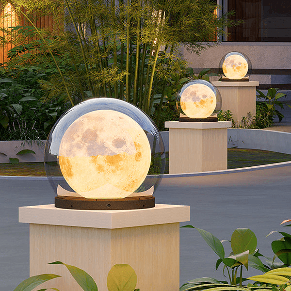 Ozdobna lampa ogrodowa w formie podświetlonej kuli z motywem Księżyca doskonale podkreśli ścieżki, podjazd lub taras, tworząc nastrojowe i bezpieczne oświetlenie wokół domu.