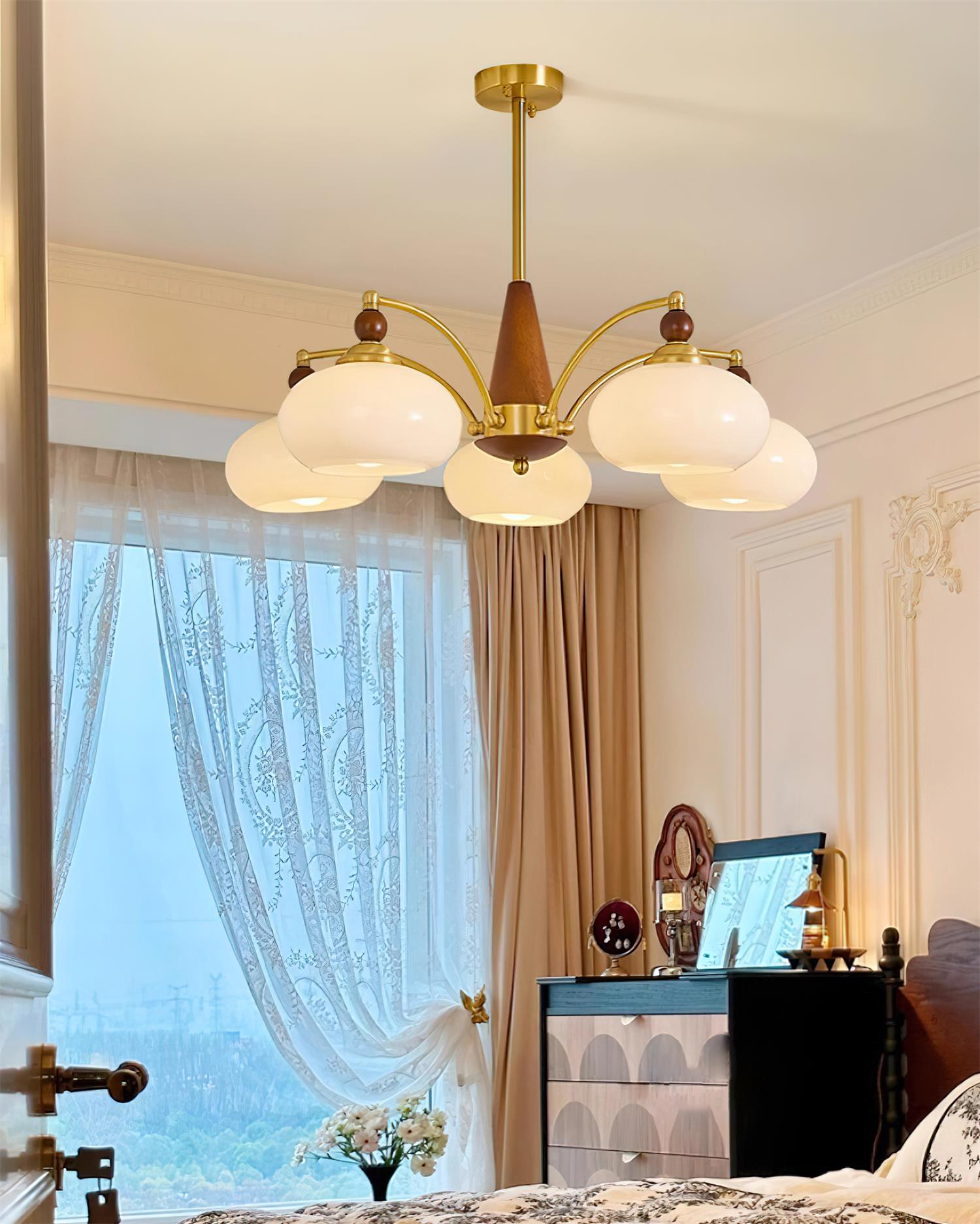 Inspirowany stylistyką epoki wiktoriańskiej, łączy w sobie metalowe ramiona, drewniane detale i szklane klosze w intensywnym, żółtym kolorze. Złote wykończenie podkreśla dekoracyjny charakter lampy, a ciepła barwa światła tworzy przytulną atmosferę sprzyjającą relaksowi i spotkaniom przy stole.